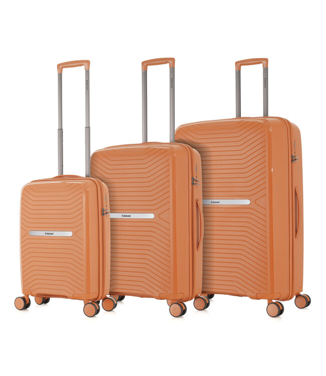 De Decent Airmate Oranje kofferset bestaat uit 3 koffers van harde polycarbonaat. Dezelfde afwerking, dezelfde kleur, één prijs. De koffers schuiven in elkaar voor compacte opslag thuis.