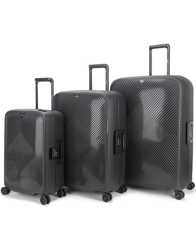 De Decent Axiss-Fix Zwart kofferset bestaat uit 3 koffers van harde polypropylene. Dezelfde afwerking, dezelfde kleur, één prijs. De koffers schuiven in elkaar voor compacte opslag thuis.