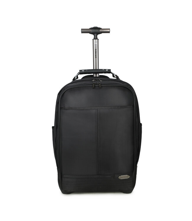 De trolley heeft twee wielen en een uittrekbare trekstang. Met een apart laptopvak en meerdere vakken voor een overzichtelijke vakindeling.