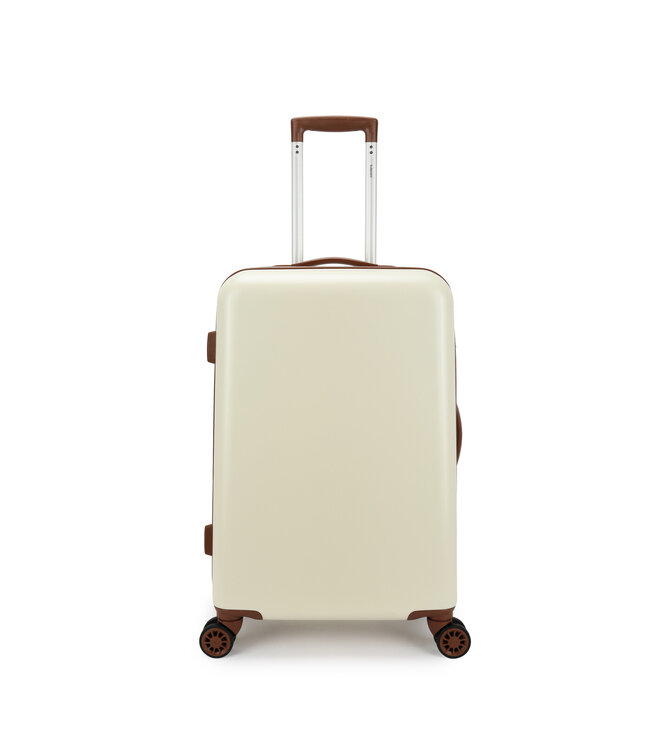 De Decent Retro Wit medium koffer is een harde koffer van polycarbonaat, 66×42×26 cm. 65 liter — goed voor een week of twee op vakantie. Leeggewicht: 3.7 kg.