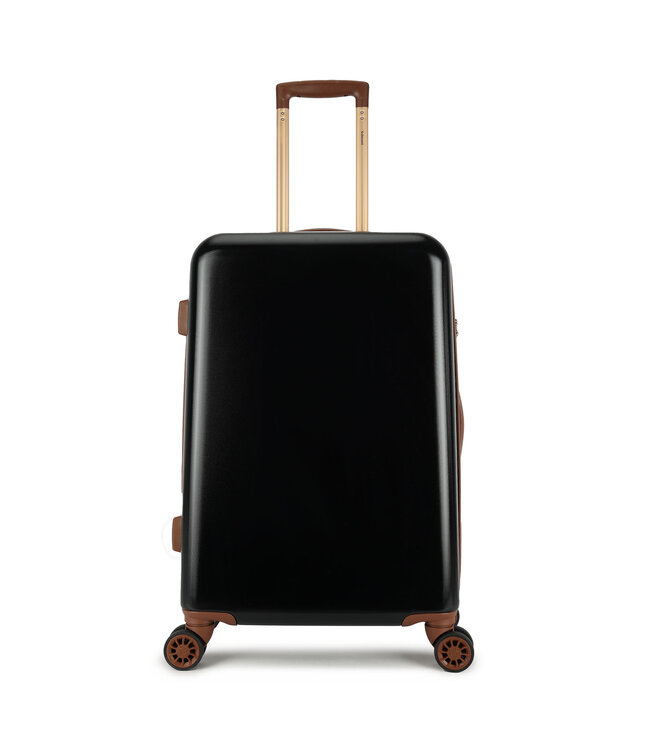 De Decent Retro Zwart medium koffer is een harde koffer van polycarbonaat, 66×42×26 cm. 65 liter — goed voor een week of twee op vakantie. Leeggewicht: 3.7 kg.