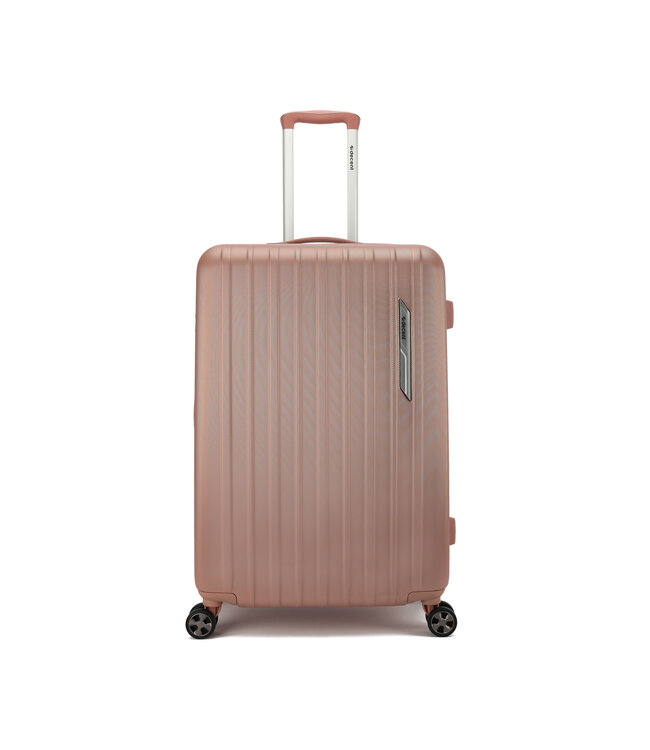 De Decent Paradiso Zalm grote koffer is een harde koffer van ABS, 76×45×30 cm. 95 liter — genoeg voor 2 weken of langer, zonder te kiezen wat er thuis blijft. Leeggewicht: 4.5 kg.