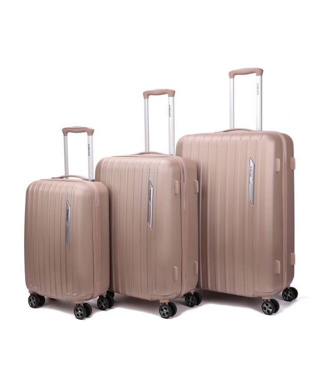 De Decent Paradiso Zalm kofferset bestaat uit 3 koffers van harde ABS. Dezelfde afwerking, dezelfde kleur, één prijs. De koffers schuiven in elkaar voor compacte opslag thuis.