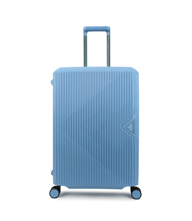De Decent Blauw medium koffer is een harde koffer van ABS, 67×46×27 cm. 73 liter — goed voor een week of twee op vakantie. Leeggewicht: 3.6 kg.
