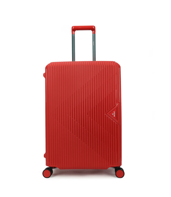 De Decent Rood medium koffer is een harde koffer van ABS, 67×46×27 cm. 73 liter — goed voor een week of twee op vakantie. Leeggewicht: 3.6 kg.