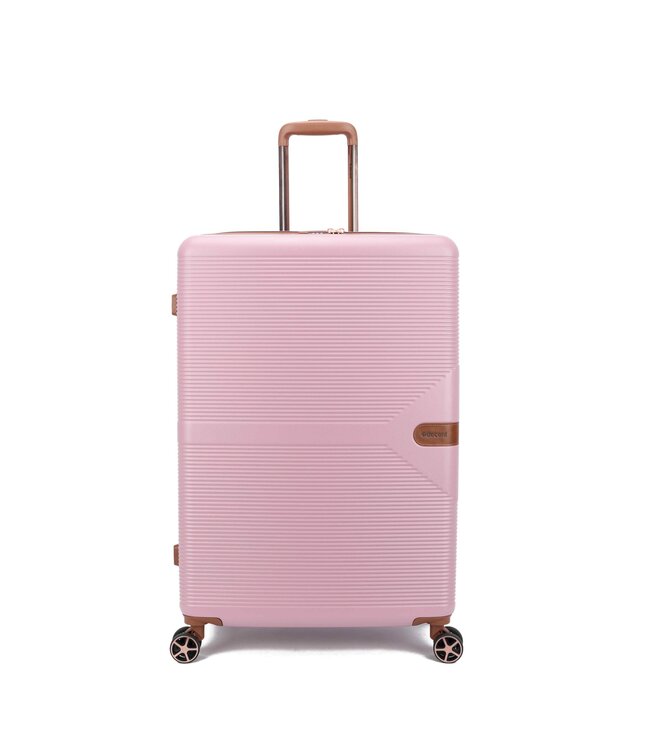 De Decent Stella Roze grote koffer is een harde koffer van polycarbonaat, 77×50×31 cm. Leeggewicht: 4.4 kg.