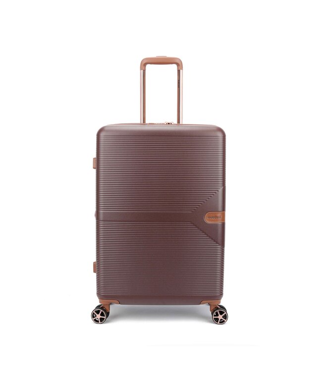 De Decent Stella medium koffer is een harde koffer van polycarbonaat, 67×44×27 cm. 67 liter — goed voor een week of twee op vakantie. Leeggewicht: 3.6 kg.