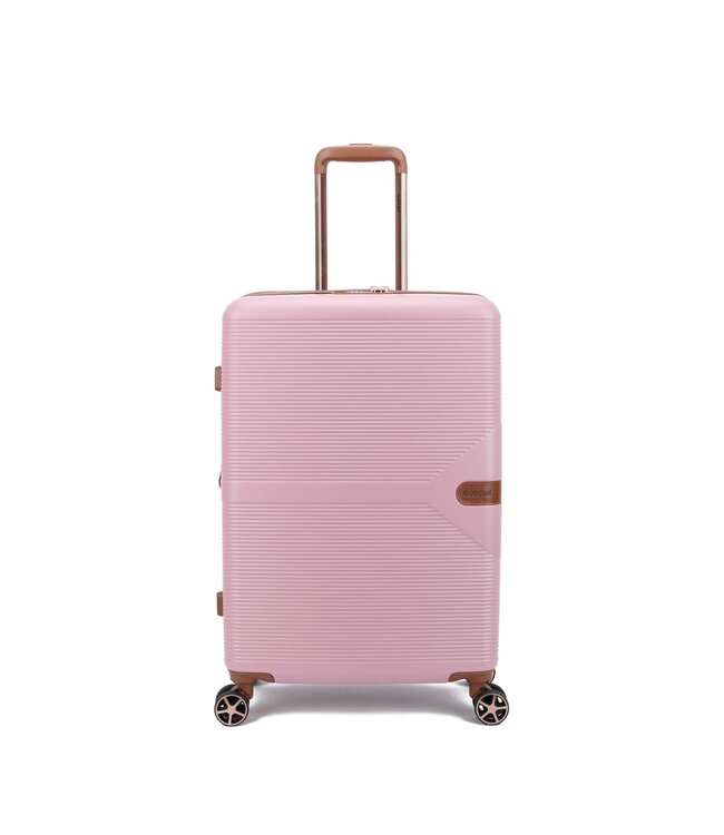 De Decent Stella Roze medium koffer is een harde koffer van polycarbonaat, 67×44×27 cm. 67 liter — goed voor een week of twee op vakantie. Leeggewicht: 3.6 kg.