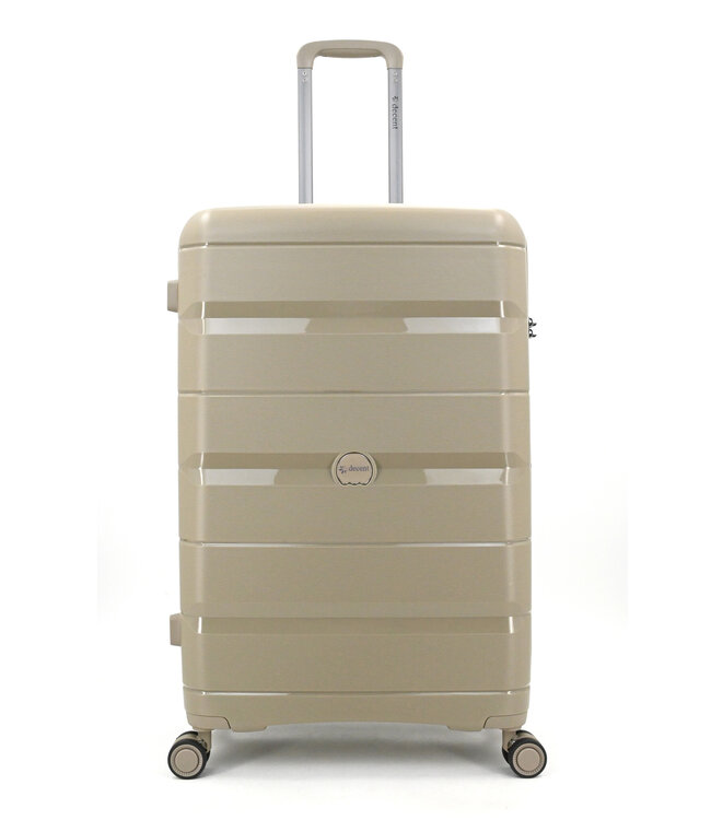 De Decent Straight-Line Champagne grote koffer is een harde koffer van polycarbonaat, 77×50×31 cm. 94 liter — genoeg voor 2 weken of langer, zonder te kiezen wat er thuis blijft. Leeggewicht: 4.