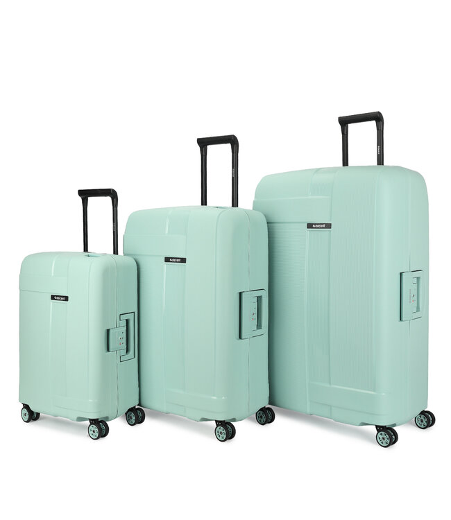 De Decent Groen kofferset bestaat uit 3 koffers van harde ABS. Dezelfde afwerking, dezelfde kleur, één prijs. De koffers schuiven in elkaar voor compacte opslag thuis.